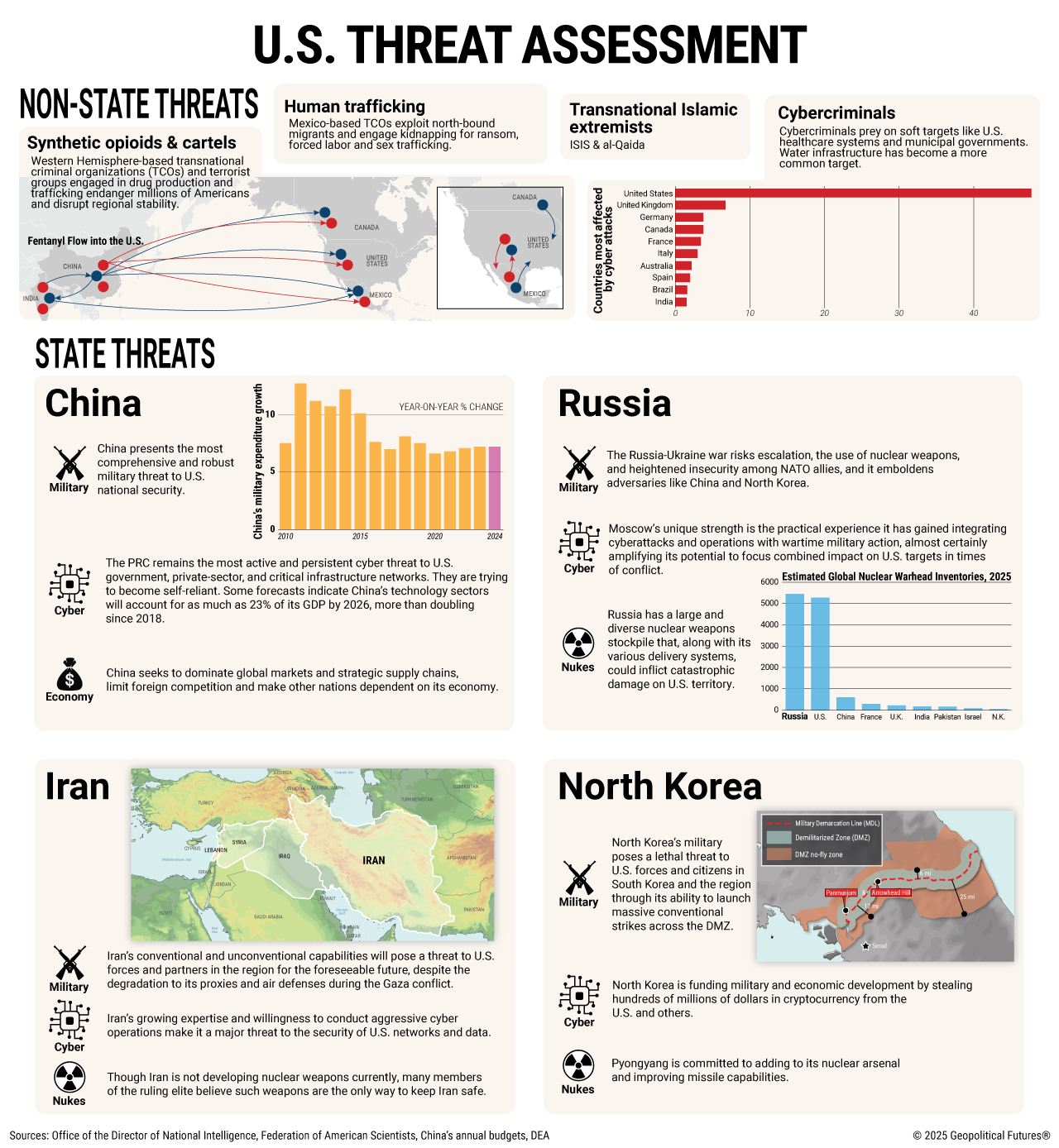 Beyond threats from state actors, the assessment underscores the threat posed by transnational criminal organizations, especially those trafficking synthetic opioids like fentanyl, which caused over 52,000 U.S. deaths last year. These groups engage in illegal migration and human trafficking. Cyber threats targeting U.S. infrastructure are accelerating too.