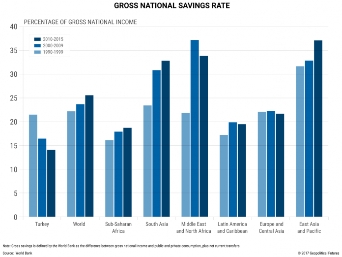 Dec. 15, 2017Ā Turkeyās savings rate, which has been decreasing steadily since 1990, is among the lowest in the world. Meanwhile, Turkeyās external debt has been rising over the past five years, which could ultimately diminish the governmentās control over its economy. Since most of Turkeyās external debt ā about 70 percent ā is held in the private sector, banks are struggling to attract sufficient deposits to meet the investment demands of President Recep Tayyip Erdoganās economic stimulus. They therefore have had to turn to foreign borrowing to provide those funds.