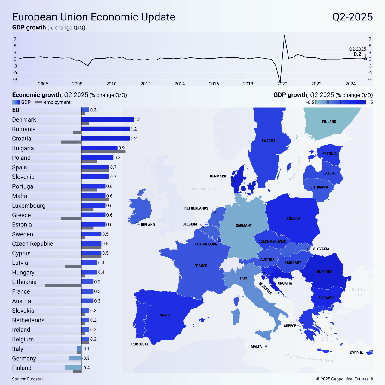 Another challenge will be the impact of U.S. tariffs, particularly on pharmaceuticals and trucks, which will affect major manufacturers. For example, Denmark led the EU in growth in the second quarter, but its central bank recently lowered its GDP forecasts for 2025-27, citing the negative effect of U.S. tariffs.