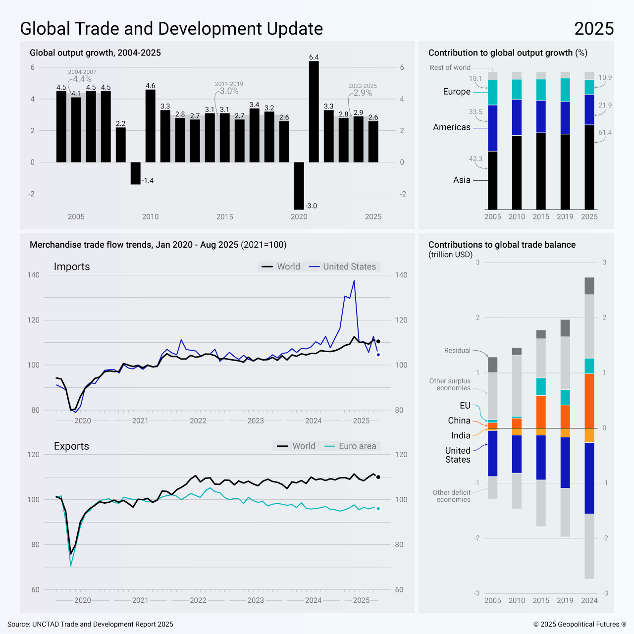 According to the latest U.N. Trade and Development Report, global economic sentiment remains negative. Output growth is still slowing, and the dominant trend is prolonged uncertainty as economies struggle to adjust to shifting external conditions. The report warns that global growth shows no sign of a quick recovery, and in fact the slowdown will likely erase part of 2025’s early momentum, when imports spiked in anticipation of new tariffs. It also underscores a widening gap between global trade and global finance, a sign of deeper structural imbalances.