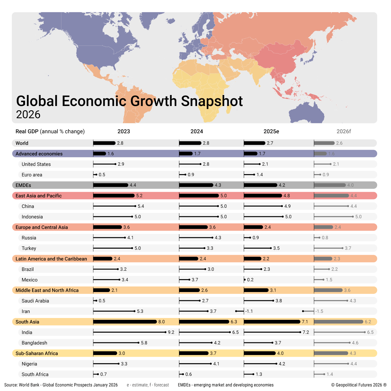 However, the World Bank does not see this hopeful trend continuing in 2026. As the favorable factors supporting the largest economies fade, the lagging impact of new trade barriers will come to the fore. This points to a continuation of trade tensions and policy uncertainty, leading the World Bank to forecast a decline in the rate of real GDP growth in several regions and economies.