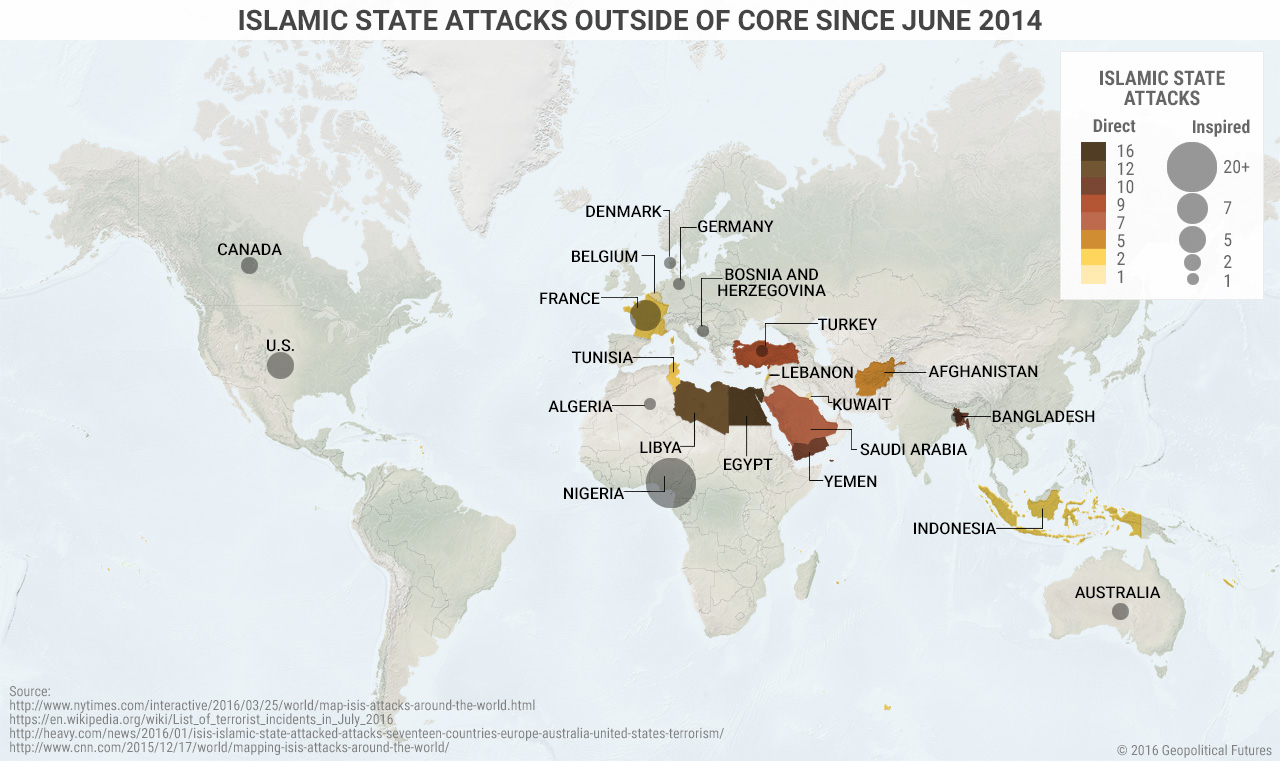 The Islamic State’s center of gravity is the small state it has carved out in what used to be Syria and Iraq. If you are a regular reader of Geopolitical Futures, you know that we have a very sober view of just how strong IS is in its core territory, and we expect that it will be much more difficult to take it away than the U.S. and its allies indicate.