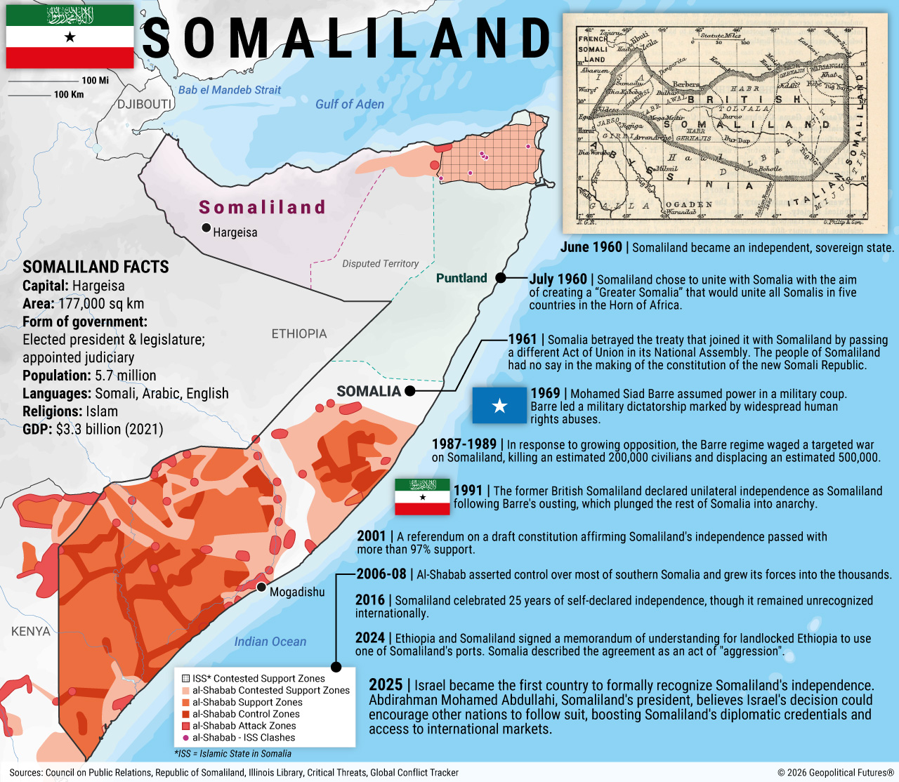More than three decades after Somaliland claimed independence from Somalia, Israel became the first country to recognize its separation. It was a long road to get here. In the 19th century, the land that is now Somaliland was colonized by Britain, while Italy controlled the rest of Somali territory. Somaliland then briefly declared independence in 1960 during the wave of decolonization, before uniting with Somalia as the Somali Republic. In 1981, militias from Somaliland coalesced to form the Somali National Movement and fight the oppressive government in Mogadishu led by Gen. Mohamed Siad Barre. The Somaliland Independence War ended in 1991 when Barreās regime fell and the SNM declared the unilateral secession of the Republic of Somaliland.