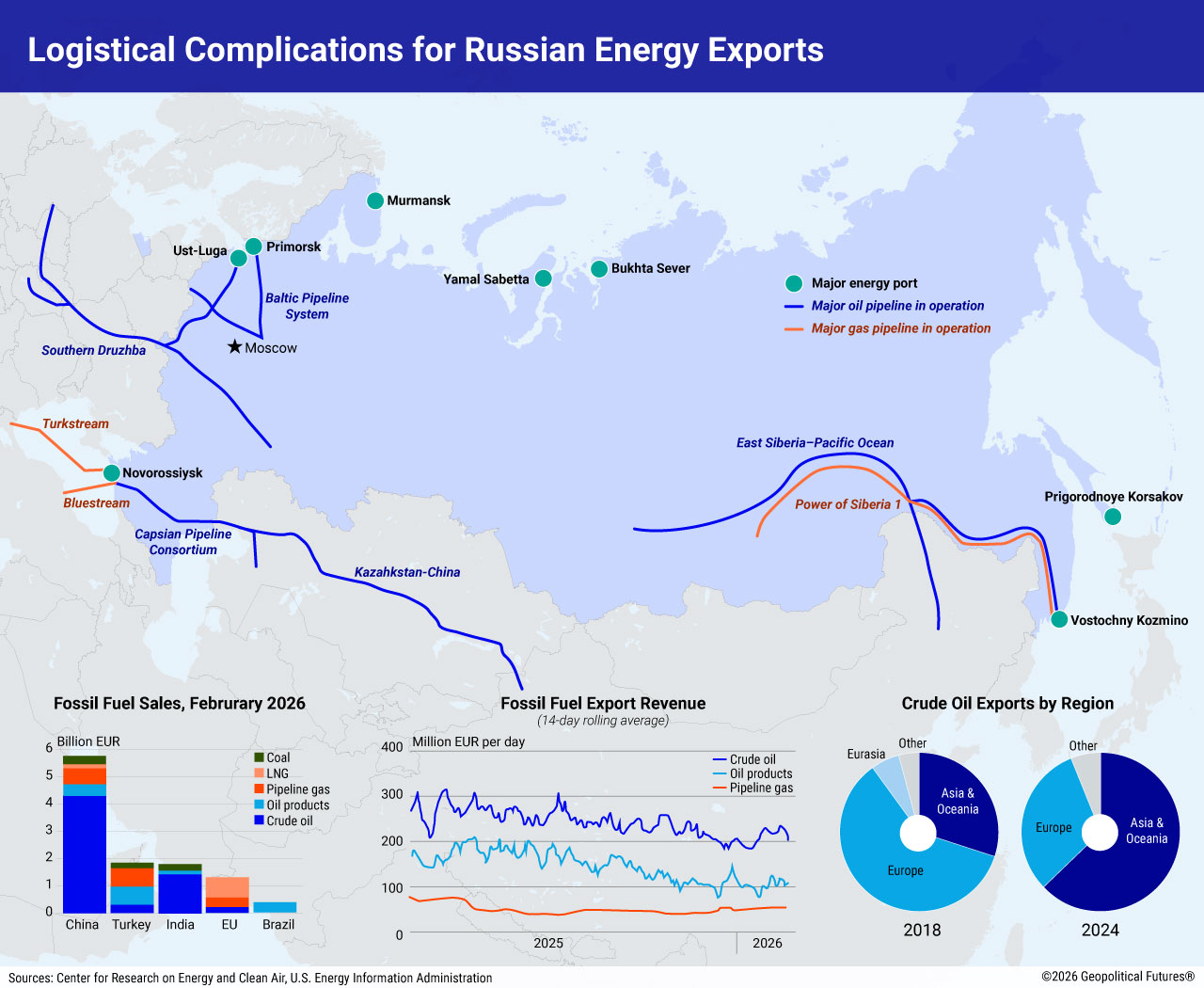 Transport infrastructure is also a limiting factor. Russia primarily exports energy via pipelines or seaports. However, it cannot fully utilize its infrastructure in the western part of the country due to sanctions, existing damage and Ukrainian drone threats against terminals and tankers. Ukraine has recently intensified drone attacks on Russian oil and fuel export infrastructure, hitting all three of Russia’s largest western oil export ports (Novorossiysk on the Black Sea, Primorsk and Ust-Luga on the Baltic Sea). Part of the Druzhba pipeline was also damaged. To the east, the issue is a shortage of pipelines and terminals. Expansion is costly and time-consuming.