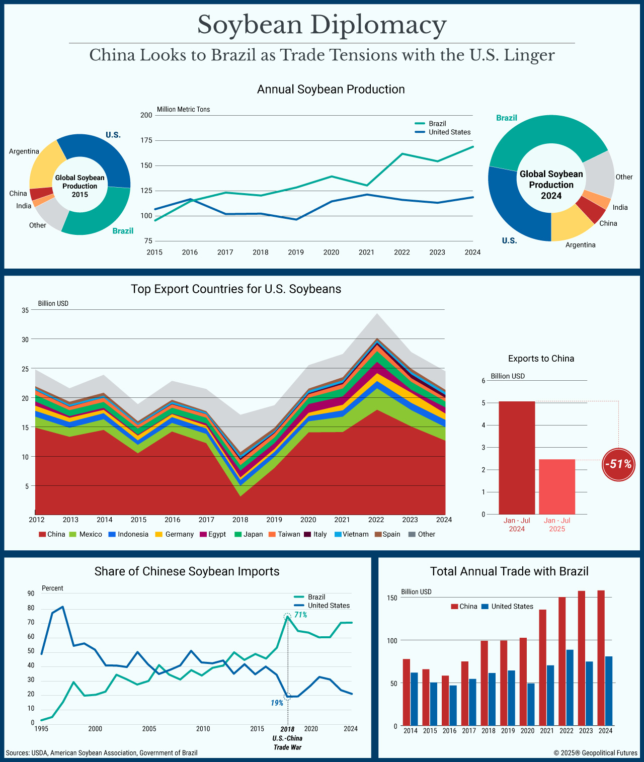 Soybeans are crucial for both Beijing and Washington: While they are one of the United States’ most important agricultural products, China also relies heavily on imports for its supply of soybeans, which above all are used as animal feed and cooking oil. With trade negotiations intensifying between the two sides, this agricultural product is taking center stage as a key bargaining chip for China. And the diversification efforts go well beyond just soybeans: China has also decreased purchases of American corn, wheat and sorghum, while continuing to buy from Brazil, Canada and Australia. This fits into Beijing’s larger-scale plan to decrease its dependency on U.S. agriculture – something it already intended to do before the trade conflict started.